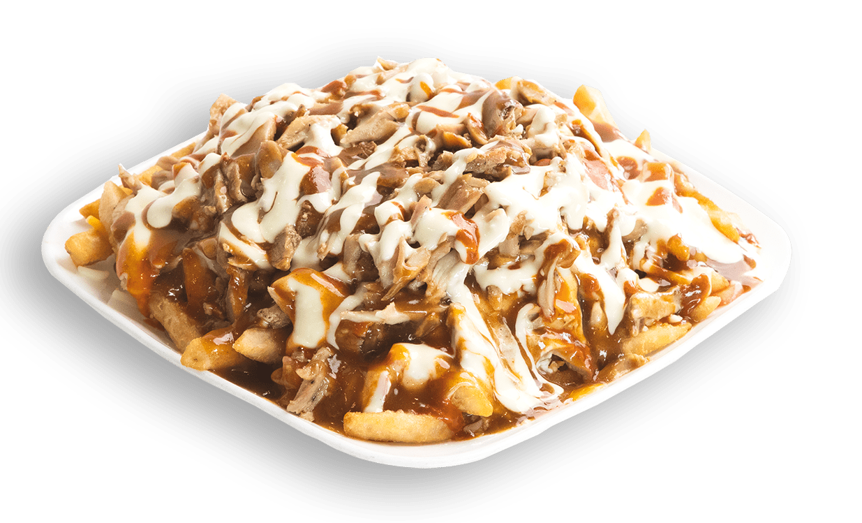 Original Poutine topped with Chicken Shawarma drizzled with Garlic Sauces.