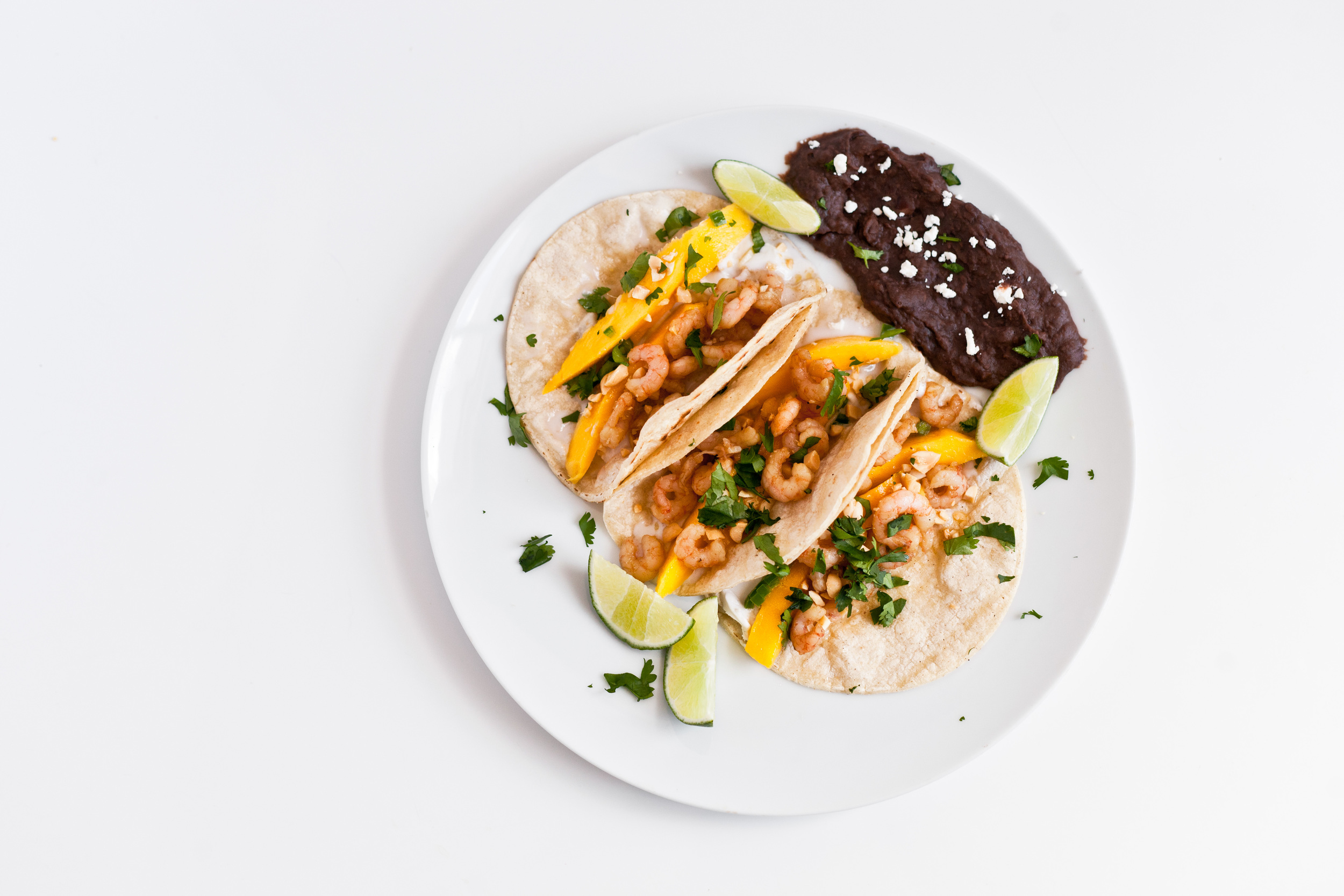 Shrimp, ground beef, Mexican rice, refried and black beans, cheese, Cilantro, and taco sauce